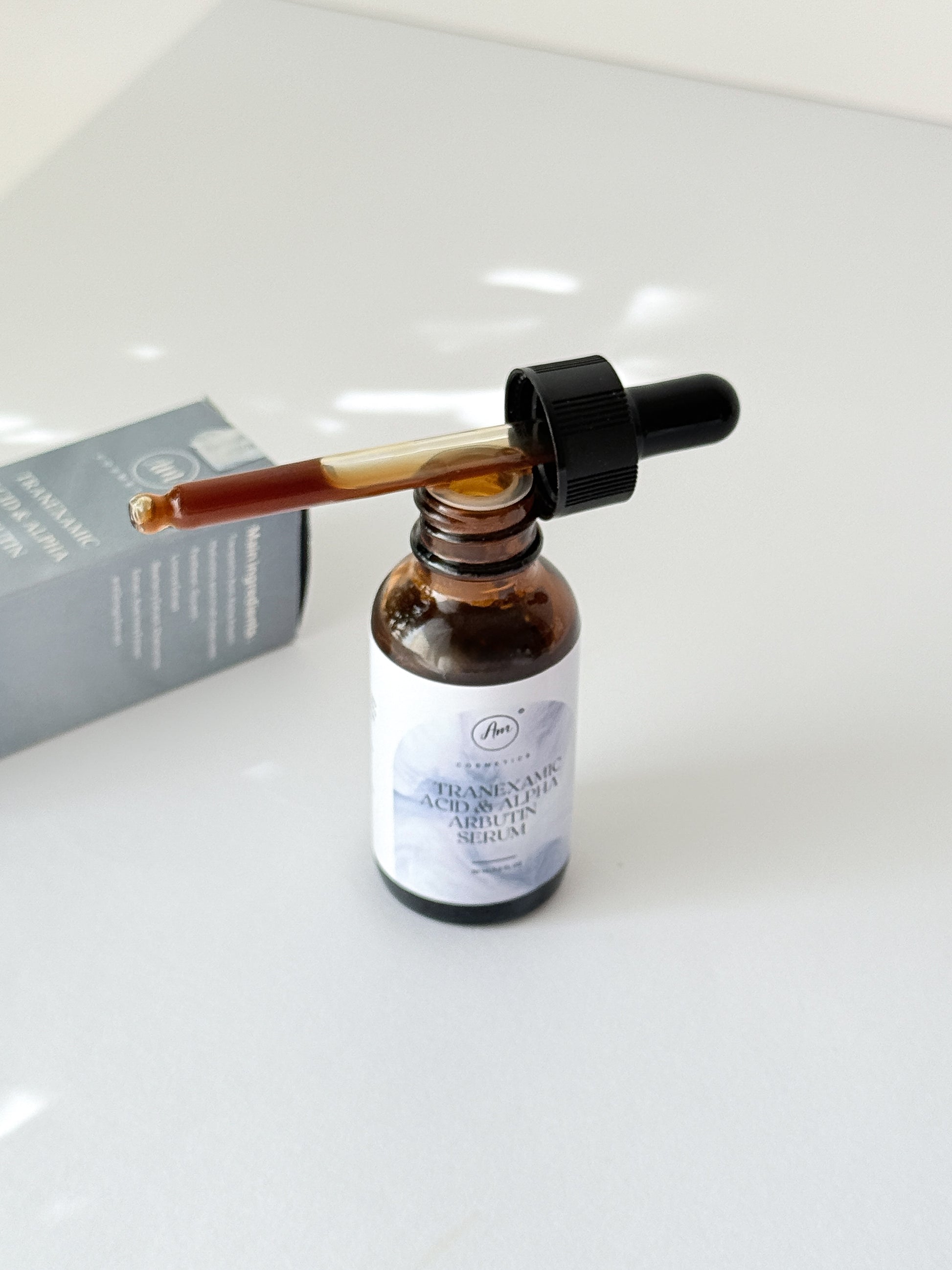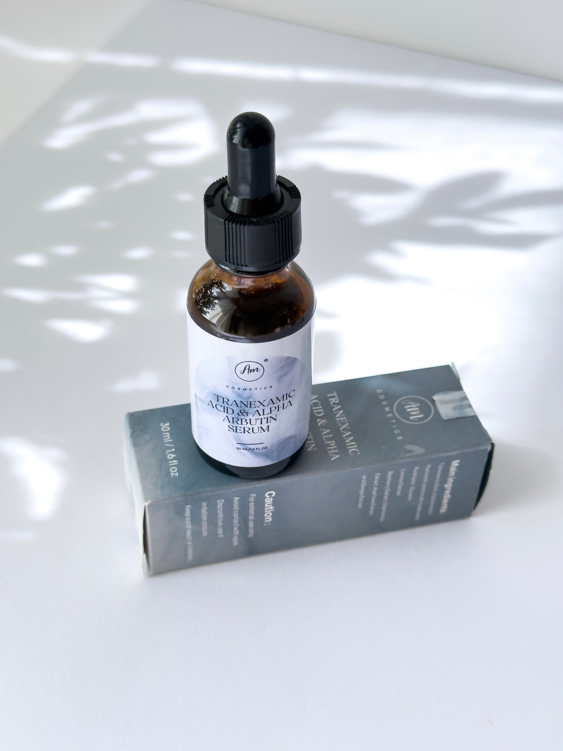 An advanced brightening serum formulated with Tranexamic Acid to target stubborn dark spots and discoloration, and Alpha Arbutin to enhance radiance. Licorice and Bearberry extracts naturally brighten, while Hyaluronic Acid, Panthenol, and Aloe Vera provide intense hydration and soothing. With antioxidant-rich Ginkgo and Chamomile, this serum promotes a more even, luminous, and revitalized complexion.